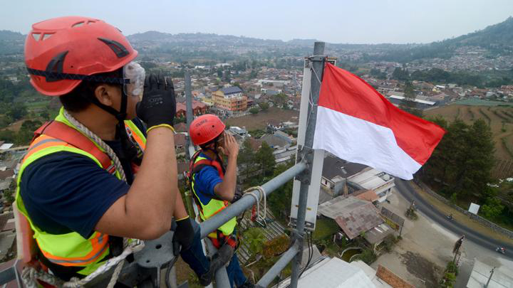 Perusahaan Telekomunikasi XL Axiata melakukan penghormatan kepada bendera di puncak menara BTS setinggi 50 Meter di Provinsi Bandung, Jawa Barat.