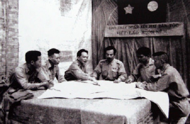 Jenderal Vo Nguyen Giap dan Pangeran Souphanouvong membahas rencana untuk membuka Operasi Laos Hulu 1953, menciptakan titik balik penting untuk memberikan kemenangan perang melawan Kolonialis Perancis bagi rakyat dua negeri Vietnam-Laos. |