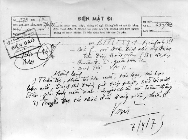 Jenderal Vo Nguyen Giap, Sekretaris Komisi Militer Pusat mengeluarkan telegram rahasia No. 1574 pada tanggal 7 April 1975. |