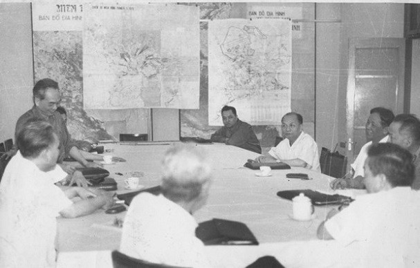 Komisi Militer Pusat sedang memantau perkembangan Operasi Ho Chi Minh pada 1975. Dalam foto, dari kiri ke kanan: Kolonel Le Huu Duc (Kepala Direktorat Pertempuran), Letnan Jenderal Hoang Van Thai (Wakil Kepala Staf Umum), Brigadir Jenderal Vu Xuan Chiem (Wakil Kepala Direktorat Jenderal Logistik), Letnan Jenderal Song Hao (Kepala Departemen Umum Politik), Jenderal Vo Nguyen Giap (Panglima Umum, Menteri Pertahanan, Sekretaris Komisi Militer Pusat), Mayor Jenderal Le Quang Dao (Wakil Kepala Departemen Umum Politik). |