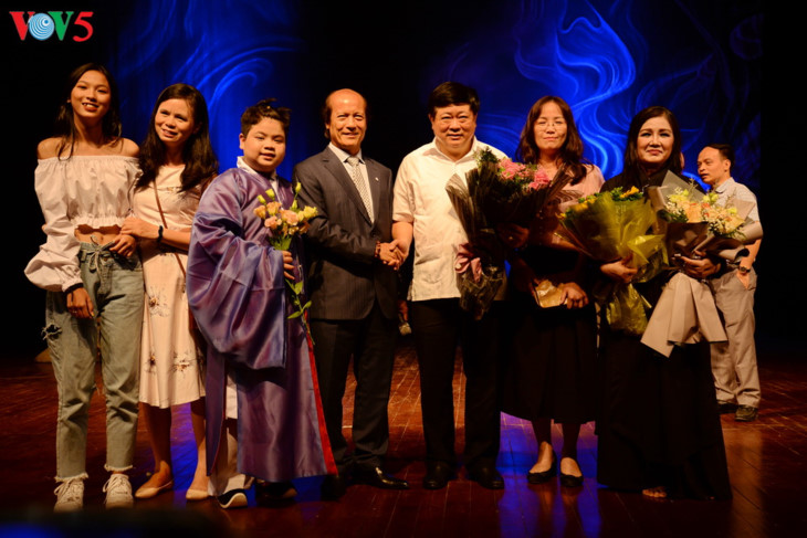 Profesor, Doktor Nguyen Xuan Thang dan Profesor Muda, Doktor Nguyen The Ki dan para undangan pergi ke panggung untuk memberikan bunga dan berfoto bersama dengan para seniman. |