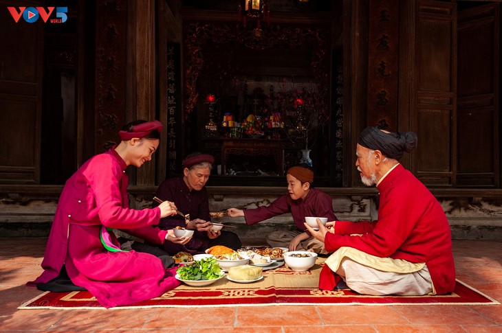 Hidangan makan keluarga di Hari Raya Tet adalah hidangan makan paling enak dan paling membahagiakan. |