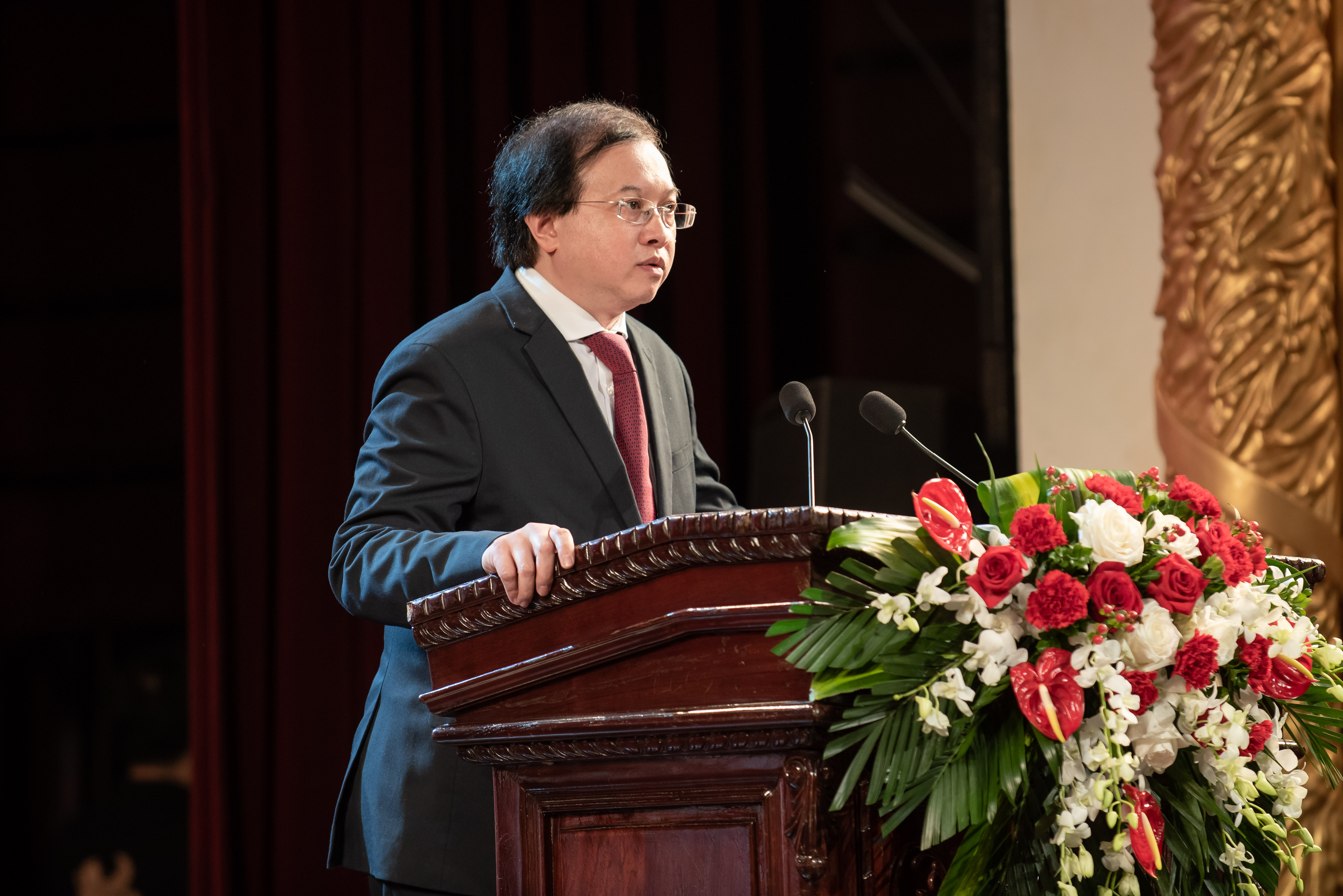 Deputi Menteri Kebudayaan, Olaraga, dan Pariwisata Vietnam, Ta Quang Dong berpidato di depan acara: