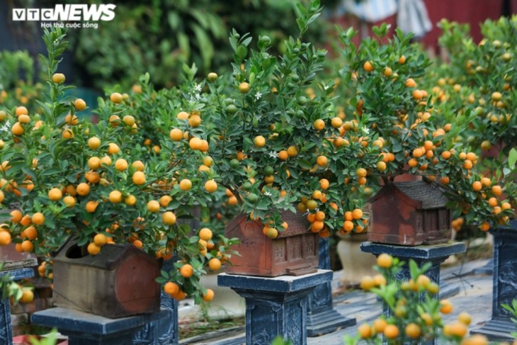 Selama beberapa hari terakhir, bermacam jenis pohon kumquat hias bonsai, kumquat feng shui dengan segala desain telah berubah menjadi kuning di seluruh desa tradisional ini.