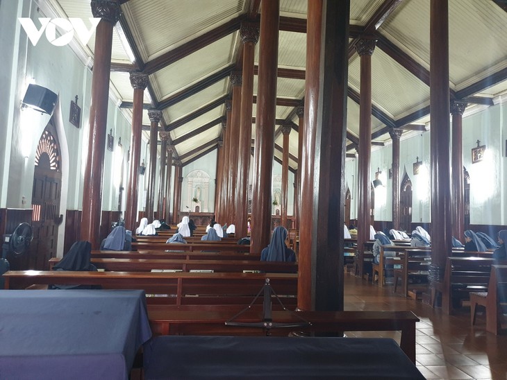 Para biarawati sedang berdoa Seninari kecil Lang Song dibangun menurut arsitektur Gothic, ragam arsitektur yang khas dari orang Eropa dalam membangun gereja. |