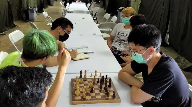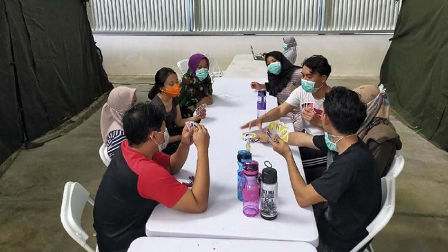 Foto: para orang yang dikarantinakan sedang main catur