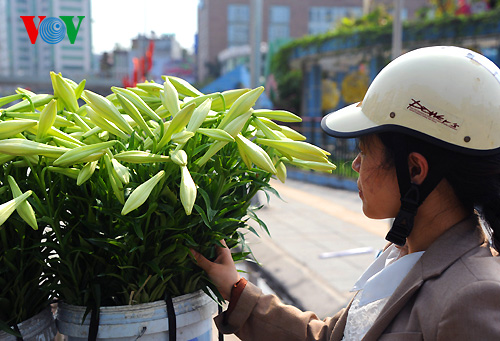 Những gánh hoa loa kèn khoe mình trong nắng mới.
