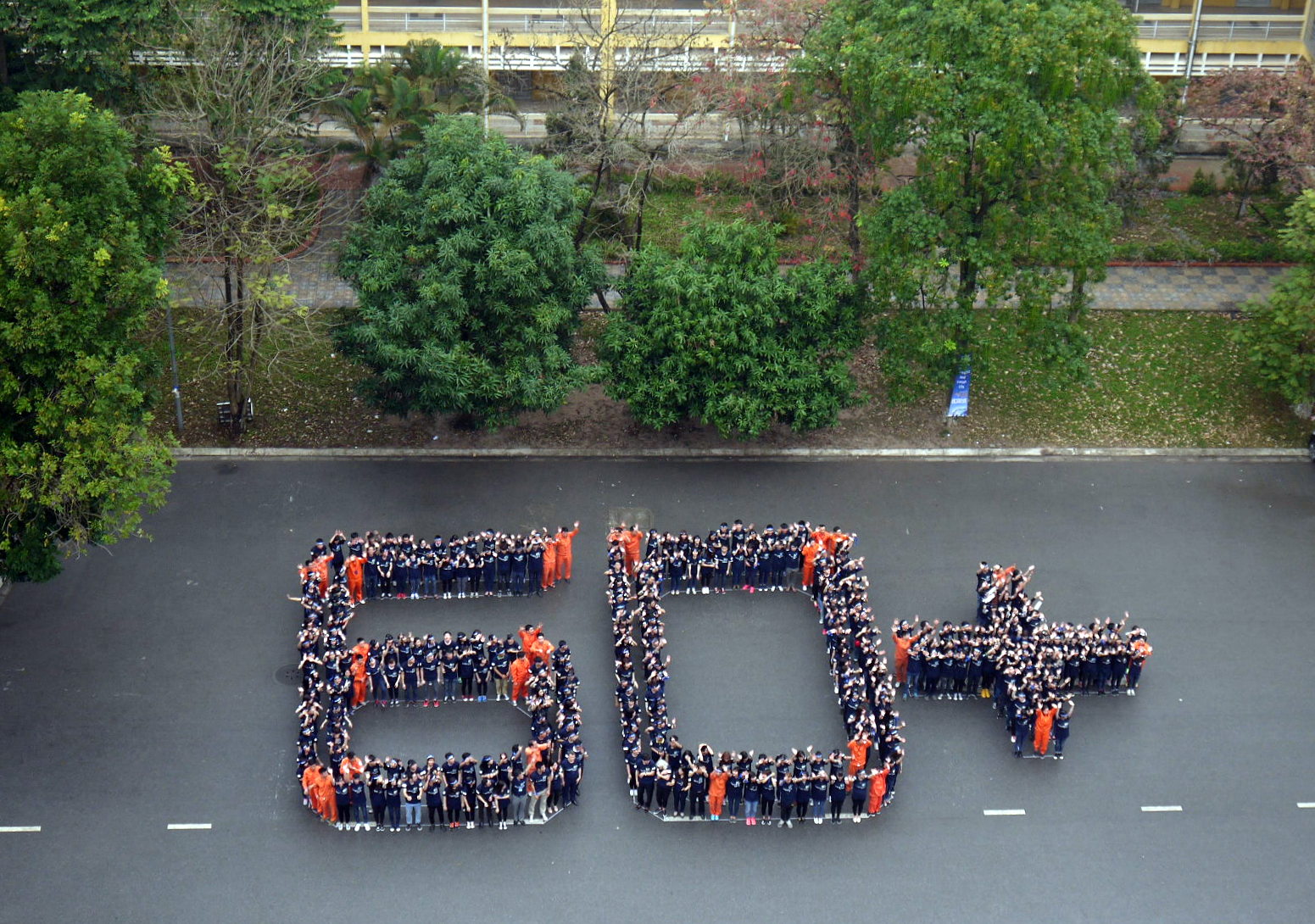 | Para relawan di kota Hanoi telah bersama-sama berbaris membentuk lambang 60+ |