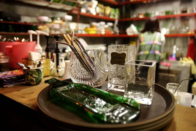 Dengan 95% benda di warung ini berasal dari barang terbarukan, para pelanggan yang datang ke sini juga merasa lebih heran ketika dapat menikmati minuman di dalam gelas kaca yang dibuat dari separo botol arak Vodka, Red Label, Vatta atau botol bir dengan bentuk yang khas. Sedotan yang dipakai bukan sedotan plastik tapi adalah sedotan dari bambu atau inox. Saudara Nguyen Van Tho memberitahukan: “Sedotan plastik ketika dibuang ke lingkungan harus memakan waktu 5-60 tahun untuk bisa hancur, sedotan dari inox bisa digunakan lama, kemudian, kita akan mensterilkannya dengan air mendidih, kemudian bisa digunakan kembali. Sedotan dari bambu ketika dibuang ke lingkungan bisa hancur dalam waktu dua bulan, lebih akrab lingkungan. Saya ingin mengubah pemahaman semua orang tentang pelestarian lingkungan. Melestarikan lingkungan adalah membela diri sendiri dan membela kehidupan kita”.