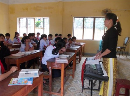Biasanya pada setiap pelajaran ada 2-3 guru yang mengajar, memainkan instrumen musik hingga menjadi lagu rakyat yang sesungguhnya. Hari ini, meski hanya ada Ibu guru Phung Thi Ngoc Hue, tetapi bukan karena para guru kurang antusias atau pelajar kurang menyukai. Guru Ngoc Hue mengatakan: