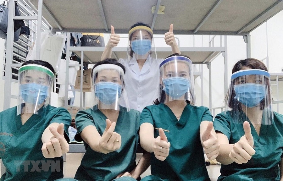 Para nakes Rumah Sakit Tropis Pusat menunjukkan semangat dan tekad dalam perang melawan pandemi Covid-19 (Foto: VNA) |