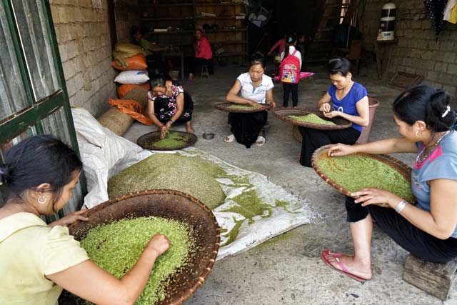 Padi setengah matang yang dipaneni akan diletakkan di tampah yang dicuci bersih dan dijemur kering. Pengambilan bernas juga harus dilakukan secara tepat caranya. Para ibu menggunakan mangkok kecil untuk menguruk padi supaya butirnya jatuh di tampah. Setelah itu, butir padi ini akan di saring supaya bersih kemudian disangan. Dalam proses menyangan, api harus sesuai, tidak boleh terlalu besar atau terlalu kecil, butir padi ini juga diaduk secara teratur supaya tidak gosong. Setelah itu, ketika tercium bau harum, kalau digigit terasa lembut maka akan dimasukkan ke tampah sampai dingin lalu baru ditumbuk. Setelah sekian waktu ditumbuk dan dipisahkan dari kulitnya, emping ketan ini menjadi bewarna hijau bagaikan daun ganyong di hutan. Emping lembut dan kenyal, membawa rasa manis dari tanah, angin, terikan mata hari, embun dan aroma lingkungan alam. Saudari Lo Thi Hien warga dukuh Co memberitahukan: “Padi ini tidak boleh ditumbuk saat masih panas karena bisa lengket satu sama lain. Ketika menumbuknya, kami juga secara bergantian melakukan penyaringan agar kulitnya tidak menempel pada emping. Proses ini dilakukan secara bergantian sampai emping ketan jadi”.