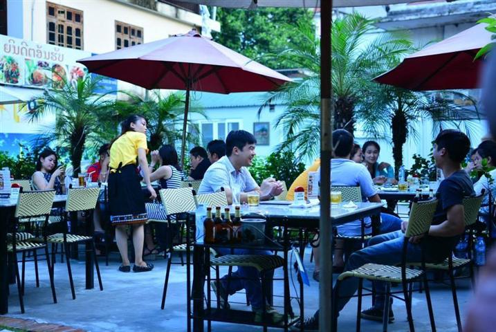 Menginjakkan kaki di pintu yang dilapisi dengan emas dan atapnya yang melengkung dari warung makan Laos, para pelanggan akan mendengarkan musik Laos yang bergema secara ringan. Dalam kompleks seluas 1000 m2, warung makan ini diatur menjadi 3 zona tersendiri: zona di udara luar dengan barisan meja batu dan kursi bambu dan rotan yang diatur secara lurus di tengah-tengah pepohonan kelapa hias, pohon bambu dll…semuanya memberikan kepada para pelanggang rasa yang nyaman dan sejuk; zona rumah dengan atap pelindung panas yang dihias dengan gambar gajah sebagai simbol negeri Laos yang bisa melayani 200 pelanggan. Selain itu ada ruang minum teh dan kopi dengan hiburan musik yang bisa melayani 150 pelanggan. Menikmati masakan sekaligus mendengarkan lagu-lagu Laos-Vietnam yang beken, saudari Nguyen Ha Phuong – salah seorang diantara orang-orang yang pernah kuliah di Laos memberitahukan: “Saya dengar dari teman-teman saya bahwa ada warung makan Laos di kota Hanoi, saya mengajak teman-teman saya datang ke sini untuk menikmati masakan-masakan Laos dan juga mau memperkenalkan kepada teman-teman saya tentang masakan-masakan Laos yang ingin saya lakukan sejak lama. Menikmati masakan di sini membuat saya ada perasaan seperti sedang berada di satu warung makan Laos di negeri Laos”.