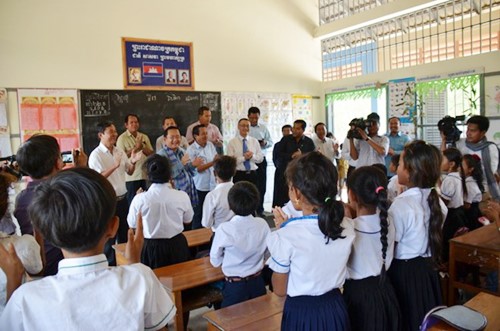 Para pelajar SD Persahabatan Ba Ria KampongThom menyambut para undangan |
