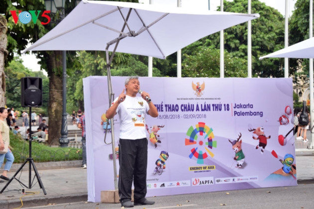Di samping lagu-lagu yang bergelora, tarian yang khas, warga ibu kota dan wisatawan juga dapat ikut serta dalam permainan teka-teki berbonus, mencari tahu tentang Asian Games 2018, memotret dengan backdrop dan melukis wajah simbol Asian Games 2018. Saudara Van Phuong, orang yang mendapat hadiah berupa payung dengan kata-kata agitasi untuk Asian Games 2018 yang diberikan oleh KBRI mengatakan: “Saya merasa sangat gembira tentang aktivitas di jalan untuk pejalan kaki pada hari ini, suasana Asian Games 2018 telah sangat dekat. Saya menunggu dapat menonton kompetisi-kompetisi yang dilakukan oleh para atlet papan atas di dunia dan juga mengharapkan agar kontingen olahraga Viet Nam menggondol banyak medali emas, mendatangkan kejayaan untuk Tanah Air”.