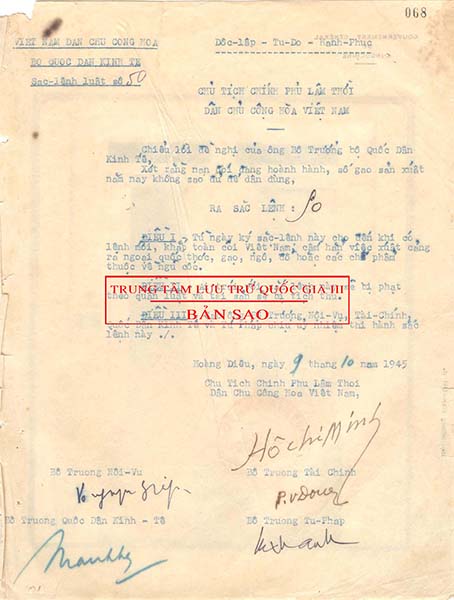 Dekrit undang-undang nomor 50, tanggal 9 Oktober 1945, naskah pertama yang mencatat kkata-kata "Kemerdekaan - Kebebasan - Kebahagiaan (Foto: tuyengiao.vn)
