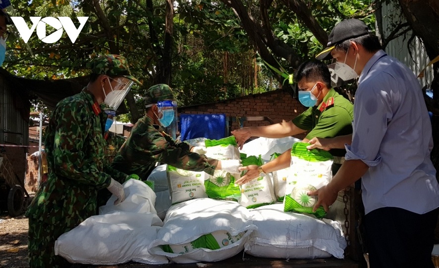 Tentara dan pasukan keamanan publik membawa barang esensial kepada warga miskin (Foto: vov)