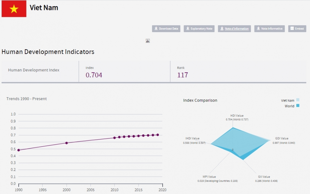Laporan Pembangunan Manusia Global 2020 yang diumumkan Program Pembangunan PBB (UNDP) di Viet Nam dan Kementerian Perencanaan dan Investasi Viet Nam pada medio Desember 2020 untuk pertama kalinya memasukkan Viet Nam ke dalam kelompok negara-negara yang memiliki Indeks Pembangunan Manusia (HDI) tinggi di dunia. Konkretnya, dengan HDI sebesar 0,704 Viet Nam menduduki posisi ke-117 di antara 189 negara dan wilayah. Viet Nam juga merupakan salah satu negara yang senantiasa melaksanakan dengan baik kesetaraan gender dengan indeks pembangunan gender (GDI) sebesar 0,997 (menduduki posisi ke-65 di antara 162 negara dan tergolong di kelompok tertinggi di antara 5 kelompok di dunia). Dengan demikian dari 1990 hingga 2020 nilai HDI Viet Nam meningkat sekitar 46 persen, tergolong dalam kelompok negara yang mencapai peningkatan HDI tertinggi di dunia. UNDP menilai bahwa tentang kualitas pembangunan manusia Viet Nam melaksanakan dengan baik semua indeks kesehatan, pendidikan, lapangan kerja, pengembangan pedesaan dan sebagainya.
