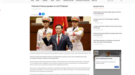 (VOVWORLD) - Ketua Majelis Nasional (MN) Vietnam, Vuong Dinh Hue melakukan kunjungan resmi ke Kerajaan Thailand dari tanggal 7 - 10 Desember atas undangan Ketua Parkemen Kerajaan Thailand, Wan Muhamad Noor Matha. Kunjungan ini mempunyai makna penting dalam konteks dua negara sedang dengan aktif menggelarkan berbagai aktivitas yang praksis untuk memperingati HUT ke-10 tahun penggalangan hubungan Kemitraan Strategis (2013 - 2023), memperkuat kerja sama parlementer bilateral secara lebih efektif.