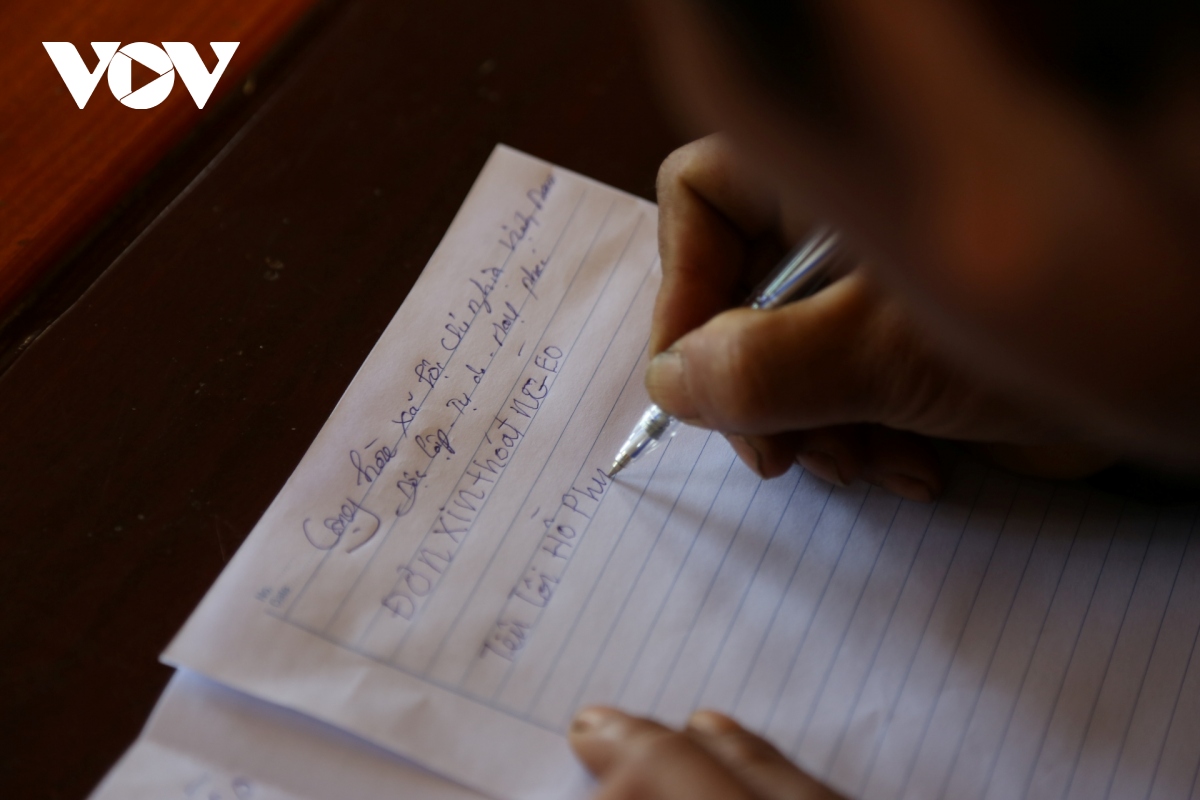 Bapak Ho Phinh menulis surat permintaan untuk mengentas dari kemiskinan (Foto: VOV) |