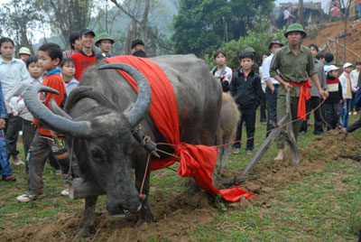 Pada hari pesta ini, seluruh warga kecamatan Thanh Hoa menyiapkan talam sesaji pemujaan untuk Dewa Tanah, Dewa Gunung, Dewa Tani dan para hulu balang. Benda-benda pemujaan biasanya terdiri dari nasi ketan, arak putih dan berbagai jenis kue, dll, dan tentunya tidak bisa kurang ayam jantan, daging babi panggang, kue “Chung”, dll. Setiap barang pemujaan ini membawa makna yang memanifestasikan keharmonisan langit dan bumi, merupakan hasil kerja dari warga desa yang rajin, menunjukkan terima kasih kepada langit dan bumi, para pendahulu dan para dewa yang selalu memberkati dan melindungi warga untuk bisa mendapat kemudahan hidup dan hasil panenan dalam produksi serta ketenteraman dalam kehidupan. Bapak Hoang Mi Lan, memberitahukan: “Pada hari pesta, semua orang membuat satu garis bajak yang melambangkan tahun baru. Orang yang membuat garis bajak ini harus merupakan seorang yang pandai di bidang pertanian”.