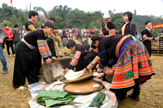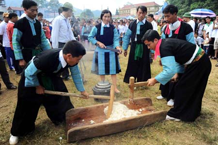 Para pemuda etnis minoritas Mong menumbuk kue "Day"