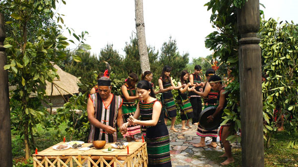 Upacara menyedekahi pintu gerbang desa diselenggarakan setiap tahun, ketika musim hujan di daerah pegunungan Tay Nguyen segera tiba, yaitu pada akhir bulan tiga atau empat kalender imlek. Sebelum upacara sesepuh desa akan menghimpun semua anggota di desa untuk menyepekati waktu dan setelah itu, dia mennyampaikan tugas kepada mereka untuk menyiapkan benda-benda yang dipersembahkan kepada para dewa.