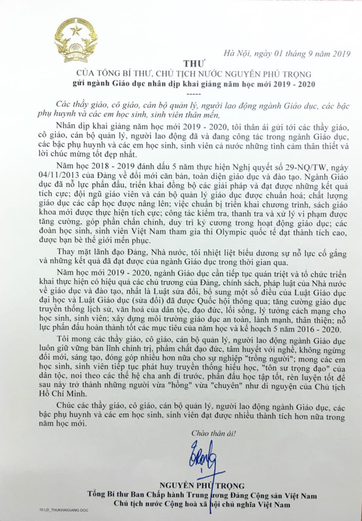 A letter by Party General Secretary and State President Nguyen Phu Trong on the occasion of the new academic year 2019-2020. |