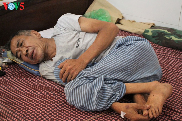 Mr. Nguyen Tien Luc, 64, has suffered from spinal paralysis for over 40 years. The illness is worse whenever weather changes. He says that thanks to the dedicated care of the Center's medical staff, his physical pain is lessened. (Photo: Manh Quynh) |