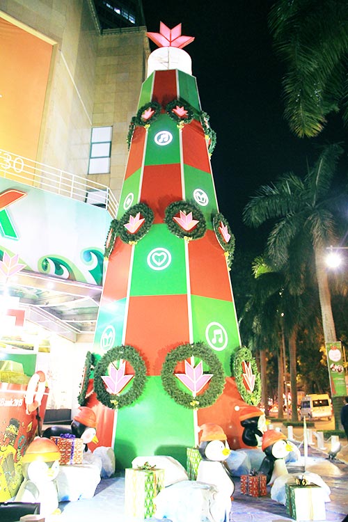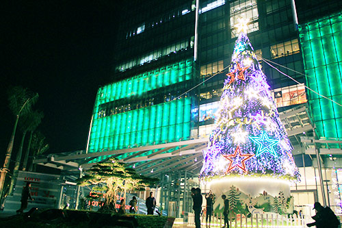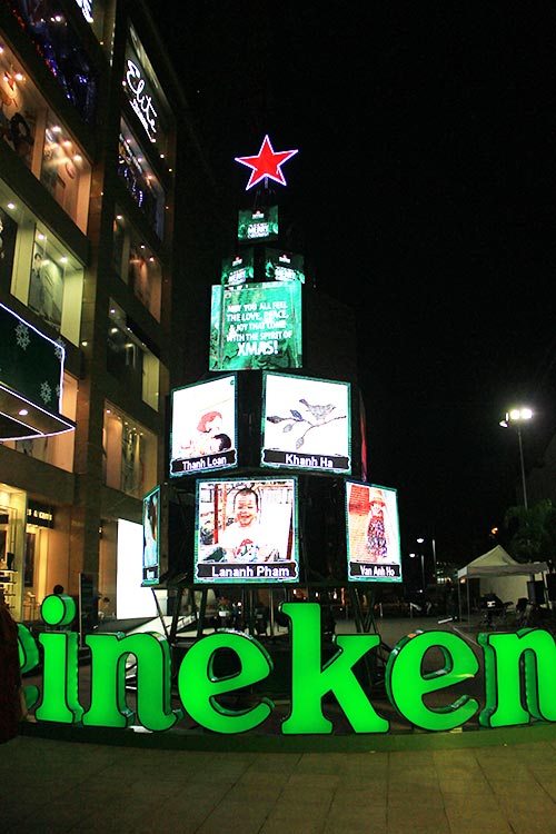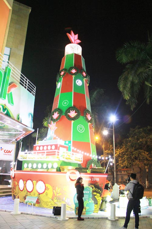 The lights of 100 LED screens shimmer and bounce wildly across this tree at the Vincom Centre on Ba Trieu.