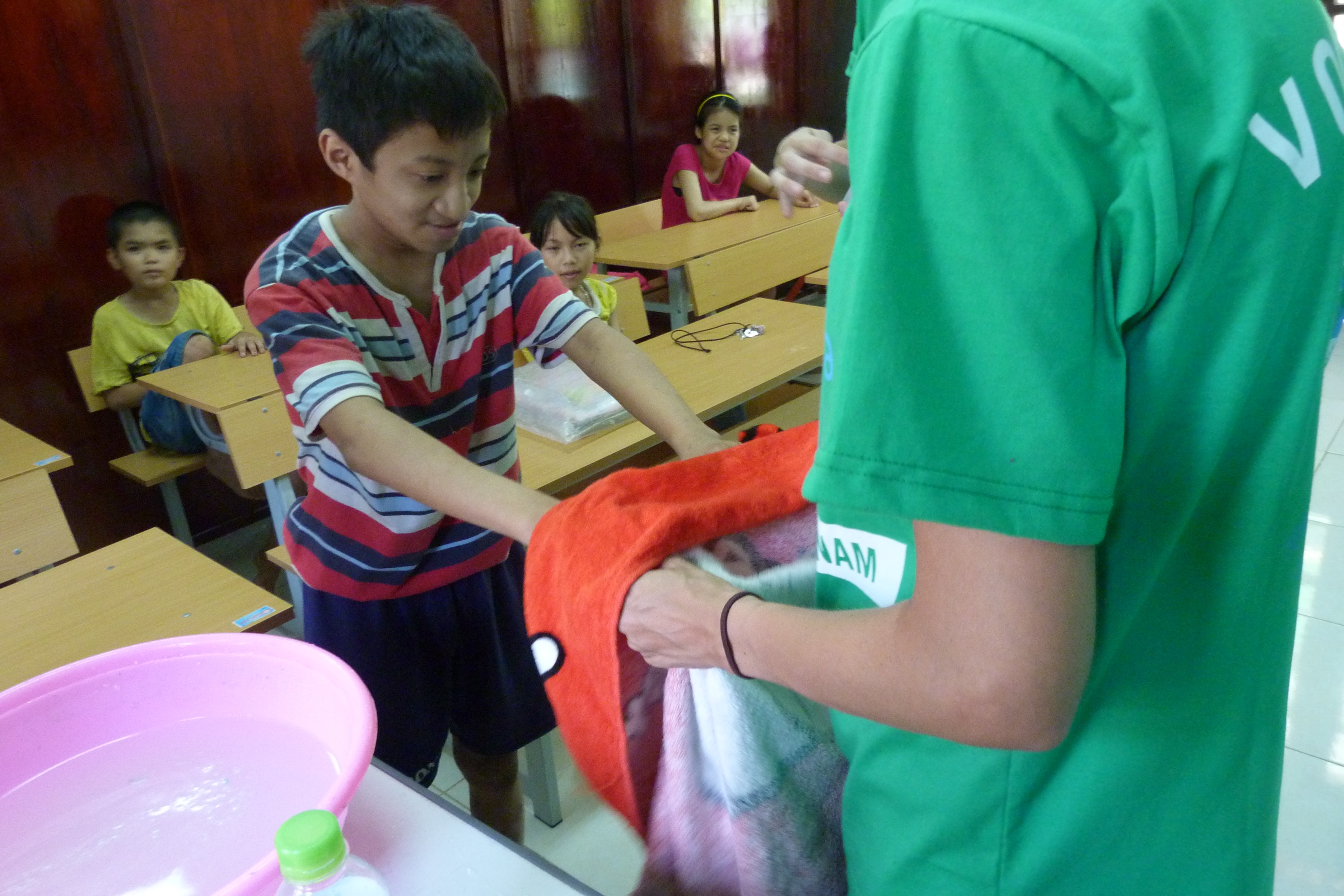 It is 10:30 when the vehicle comes to a stop in front of the rehabilitation center. The trunk is popped open for volunteers to carry out the supplies they will need for the day: buckets, soap, towels, glitter and posters. Heading up to the conference room, a small meeting with the head of social work is organized in order to understand what Thuy An is all about. “After a couple of years, many children leave the center completely healed from their handicap. That way they can reintegrate society with less difficulties”, he said with a hint of pride.