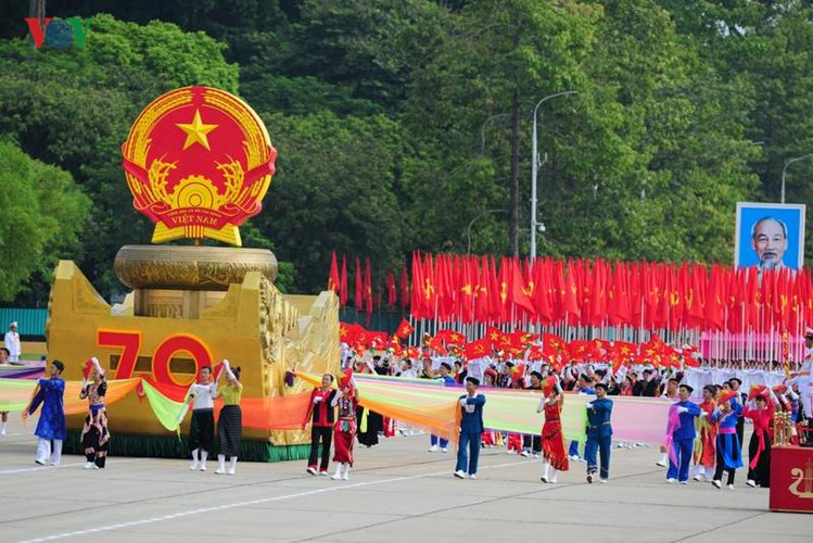 (VOVworld) - A massive military parade with the participation of around 30,000 people was held in Hanoi’s Ba Dinh Square on September 2 to celebrate the 70th anniversary of the August Revolution (August 19) and National Day (September 2). Opening the ceremony, a torch symbolizing the vitality of the people of Vietnam was brought from the Ho Chi Minh Museum to the historic Ba Dinh Square by outstanding athletes, and then lit throughout the celebration.Following the flag-raising ceremony, a 21-gun salute was fired from the Thang Long Royal Citadel to celebrate the national important anniversary. VOV captured moments of the parade: