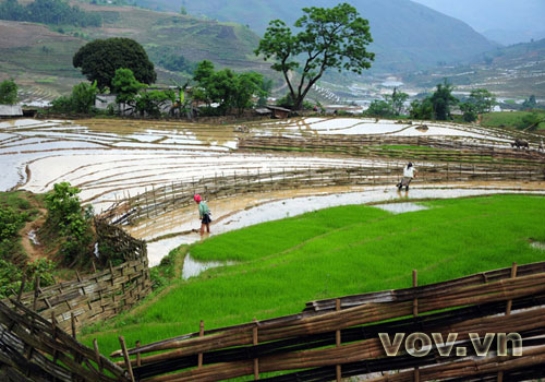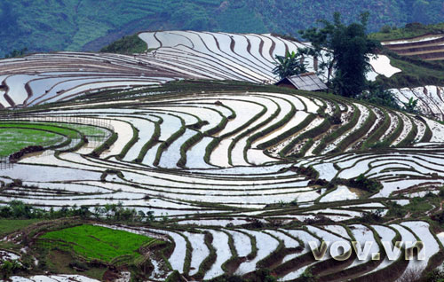 (VOV) - Green terraced fields at the foot of the mountain seemingly keep off the intense heat of the sun in summer. Photos taken by Pham Bang on the way from Lao Cai City to Bat Xat district.