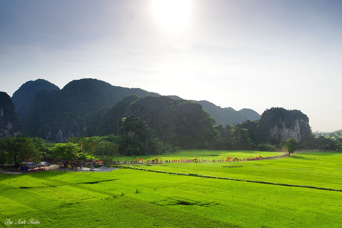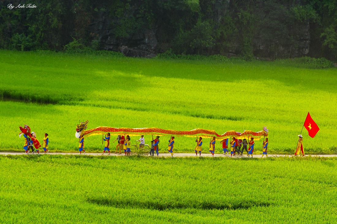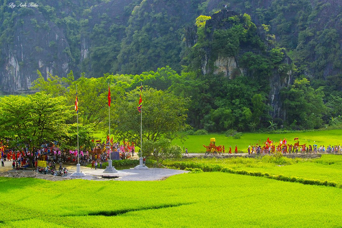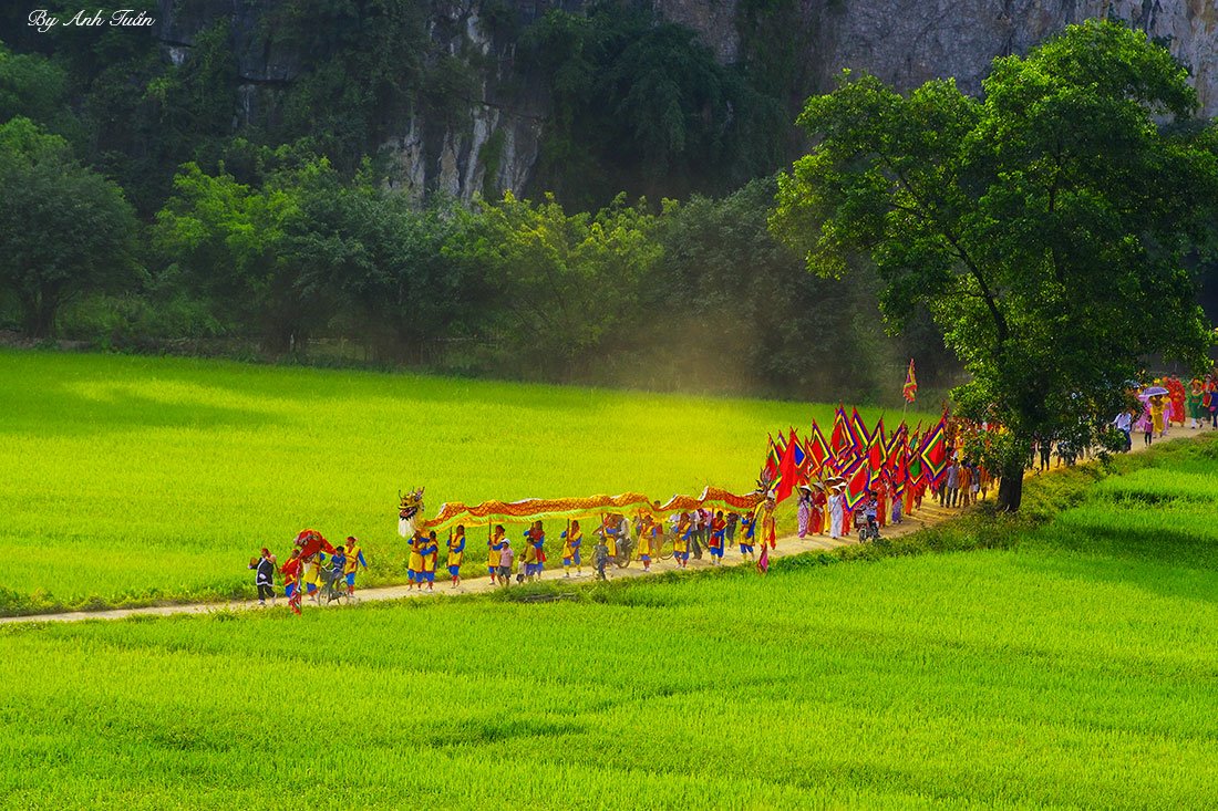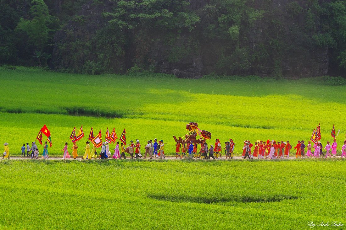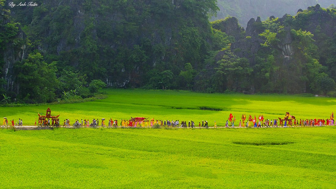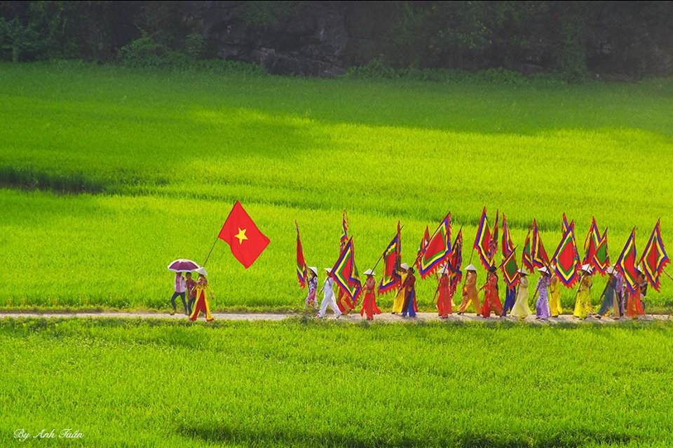 ![]() On the morning of the 14th day of the 3rd lunar month, the procession, which comprises of 30 troupes coming from districts across Ninh Binh province, approaches Thai Vi temple.