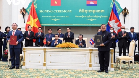 (VOVWORLD) -President of Voice of Vietnam Do Tien Sy and Cambodian Information Minister Khieu Kanharite, on Tuesday signed a memorandum of cooperation for the period of 2022-2025. The signing was witnessed by Prime Minister Pham Minh Chinh and Cambodian Prime Minister Samdech Hun Sen.