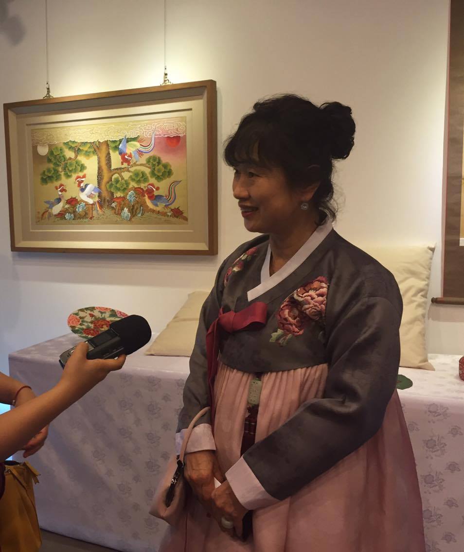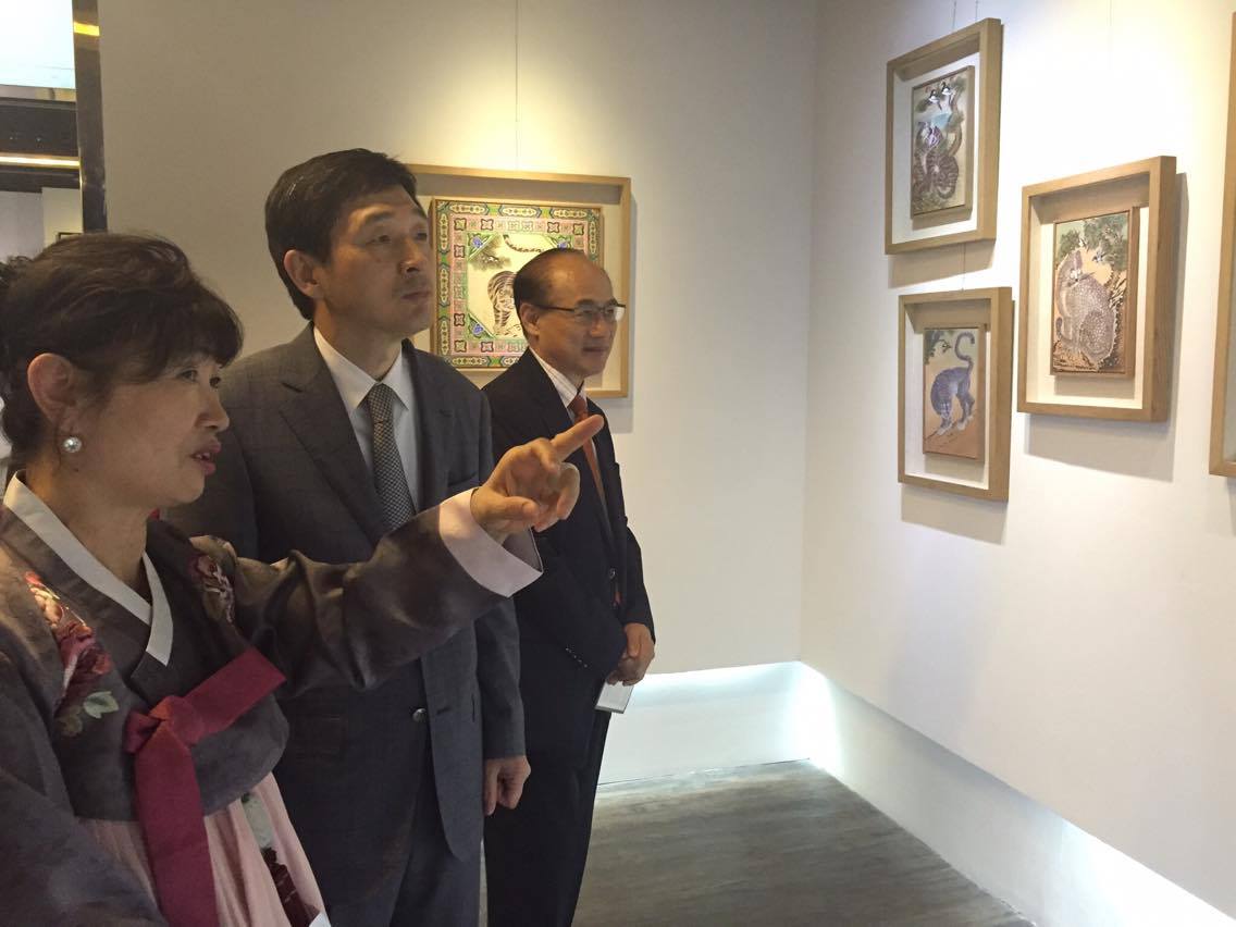 Yet the highlight of the exhibition lies in several unique pieces featuring a tiger and magpies, which really stand out for their sophisticated detail, colors, and layout. The featured artist of the exhibition, Jung Seung Hui, explained that the paintings of tigers and magpies are distinctive and cannot be found in any other country. She says:“When you look at the painting, you can feel the typical Korean humor and satire in it. The tiger here does not look like a normal fearsome and scary one but more like a friendly and funny cat. We believe it would keep the evil spirits away. And above it is the magpie perching on a branch, which Koreans believe can bring good news or precious friends. So families in Korea would hang a painting like this at the front door to keep luck and happiness.”