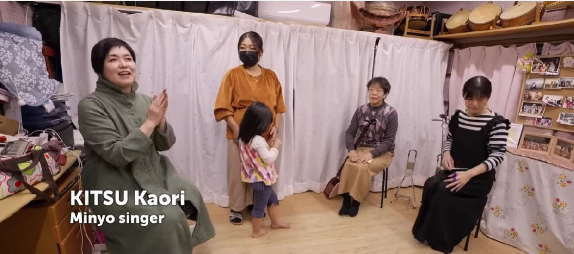 Singer Kitsu Kaori teaching children to sing minyo (Photo: screen shot of the video provided by the Embassy of Japan) |