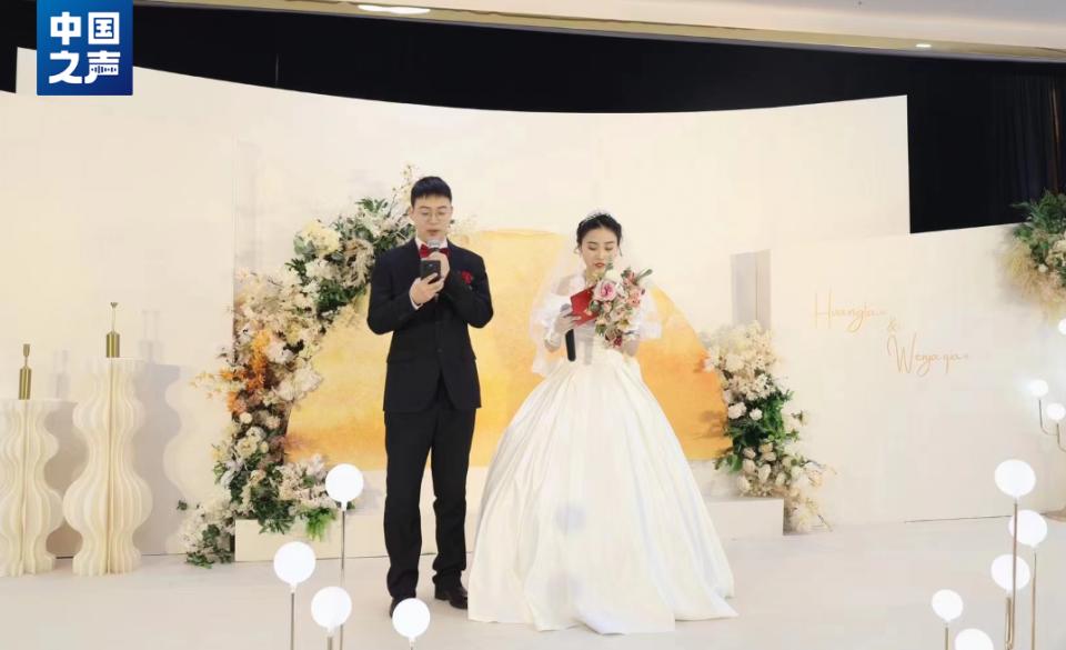 Bridegroom Huang Tao and bride Wei Ya Qiao are their own wedding MC. (Photo: CNR) |