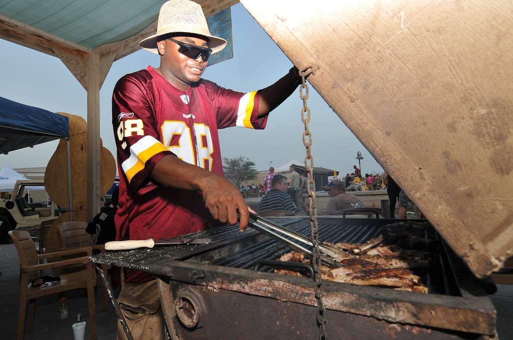 A football fan grills some ribs for his team during a tailgate party at Camp Lemonnier in 2012. (Photo: Public Domain)