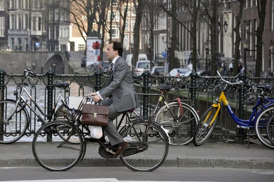 A man in suit on bike in Amsterdam. According to the Netherlands' Ministry of Transport, Public Works and Water Management, here 25% of trips to work are made by bike. (Photo: sydneycyclechic.org)