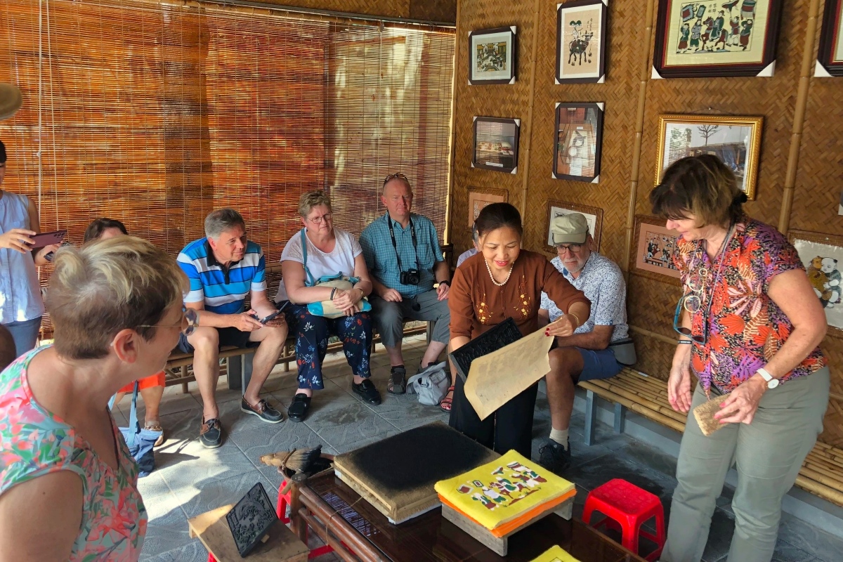 Foreign visitors take part in hands-on experiences at the Dong Ho Folk Painting Cultural Exchange Center run by Nguyen Đang Tam’s family (Photo: Courtesy of Nguyen Dang Tam) |