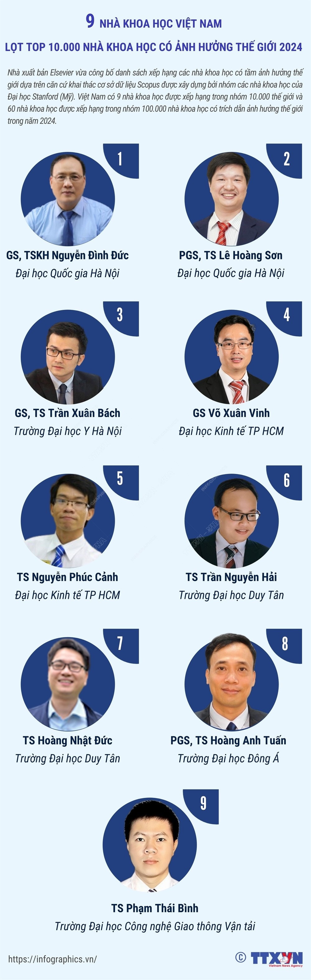 Other Vietnamese scientists on the list are: Prof. Dr. Võ Xuân Vinh of the University of Economics Ho Chi Minh City, ranked 2,327; Dr. Trần Nguyên Hải of the Duy Tan University, ranked 2,905; Dr. Hoàng Đức Nhật of Duy Tan University, ranked 3,635; Dr. Phạm Thái Bình of the University of Transport Technology, ranked 3,773; Dr. Nguyễn Phúc Cảnh of the University of Economics Ho Chi Minh City, ranked 4,727; Prof. Dr. Trần Xuân Bách of the Hanoi Medical University, ranked 5,085; Prof. Dr. of Science Nguyễn Đình Đức of the Vietnam National University, Hanoi, ranked 5,750; and Prof. Dr. Nguyễn Xuân Hùng of the Ho Chi Minh City University of Technology, ranked 9,612.
