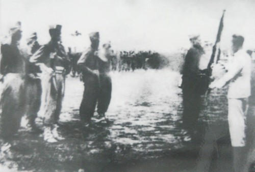 | Präsident Ho Chi Minh besuchte die Hochschule Tran Quoc Tuan am 26. Mai 1946 und überreichte der Hochschule eine Flagge mit den Wörtern “Dem Land und der Bevölkerung treu”. |