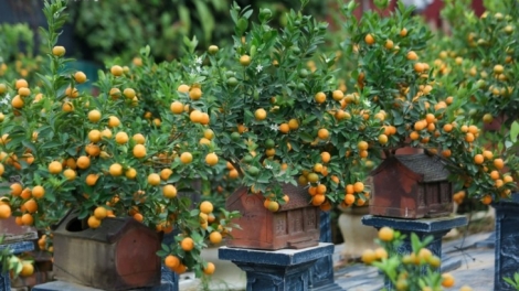 (VOVWORLD) - Kumquatbonsais in Gefäßen in Form eines alten Hauses sind eine der einzigartigen Zierpflanzenarten zum Neujahrsfest Tet 2022.