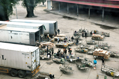 Die Transporter beim Beladen am Grenzübergang in Hoang Mo in Quang Ninh.