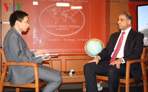 | Puneet Telwar (r.) beim Gespräch mit Korrespondenten der Stimme Vietnams. |