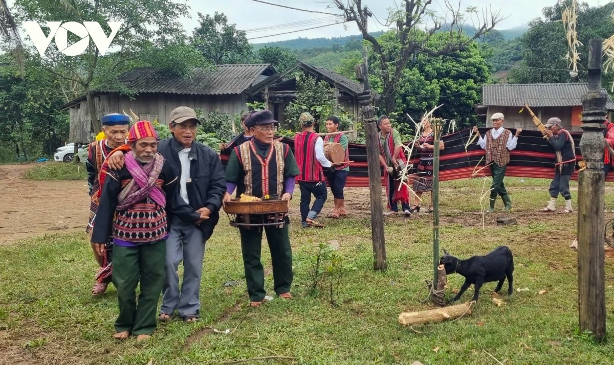Wenn die Opfergaben vorbereitet sind, wird eine Ziege an den Baumstamm gebunden. Der Dorfälteste Ho Xuan Van, das Oberhaupt der Familie Kray, steht mit einem Brokattuch in der Hand vor dem Altar und betet, um dem Berggott, dem Flussgott und dem Sonnengott zu danken und für ein friedliches und glückliches Leben der Dorfbewohner zu beten. Dazu der Dorfälteste: