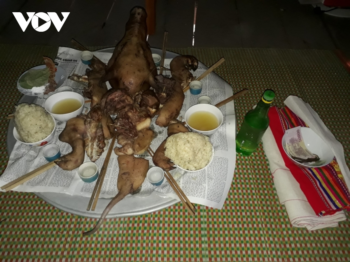 Neben einem Tablett mit fünf Obstsorten, Räucherstäbchen, Betelblättern und Areca-Nüssen, gekochtem Klebreis, Schnaps sind gekochtes Schweine- und Hühnerfleisch unentbehrliche Opfergaben. Schweinefleisch und –Innereien wie Leber und Herz werden gekocht und in kleine Stücke geschnitten. Dann werden sie mit geschnittenen gekochten Bambussprossen und Gewürzen gemischt. Das ist ein unentbehrliches Gericht für Verstorbene. Tong Van Hia, ein Schamane im Dorf Mong in der Stadt Son La, erklärt: