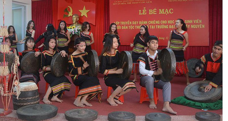 Seit drei Monaten, am Abend von Montags, Mittwochs und Freitags hört man an der Universität Tay Nguyen oder im Hochland die Klänge von Gongs aus den Klassen der Studierenden ethnischer Minderheiten. Siu Lok, ein Angehöriger der J’Rai und Studierende der Medizinischen Fakultät, kennen das Gong-Spielen seit langem. Aber in der Klasse, mit der Hilfe von Lehrern weiß er mehr über das Spielen dieses Instruments: