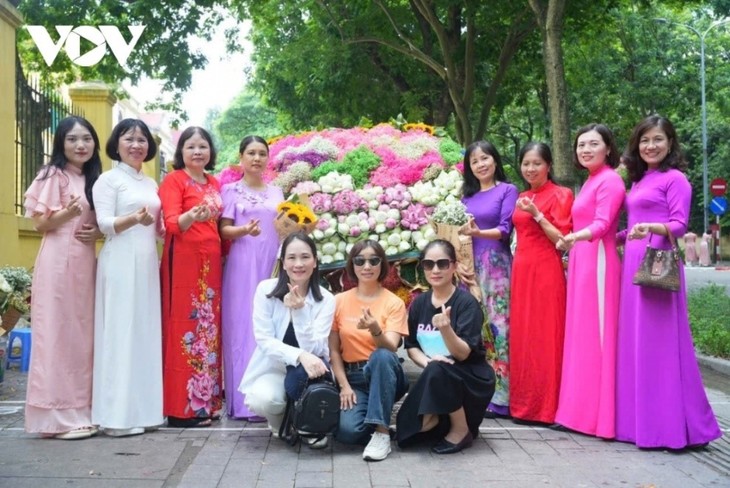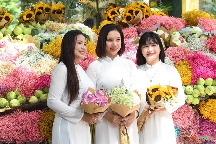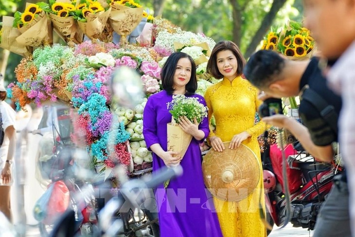 | Frauen im bunten Ao Dai an einem mobilen Blumenladen. (Foto: Thuy Ngoc/VOV) |